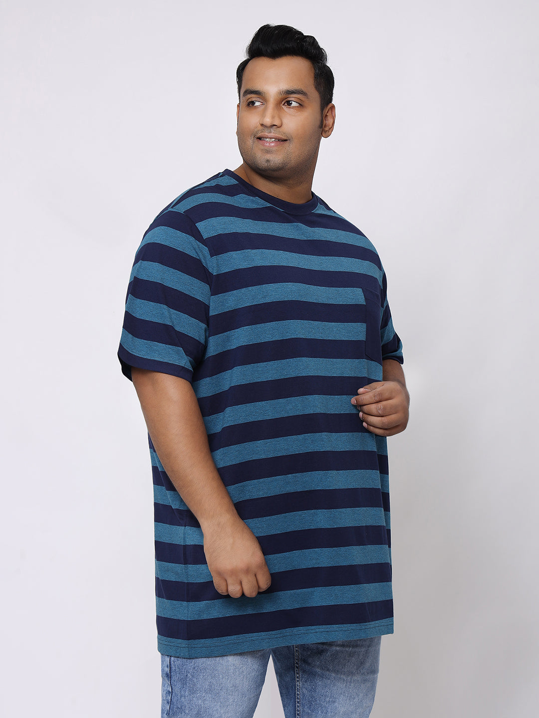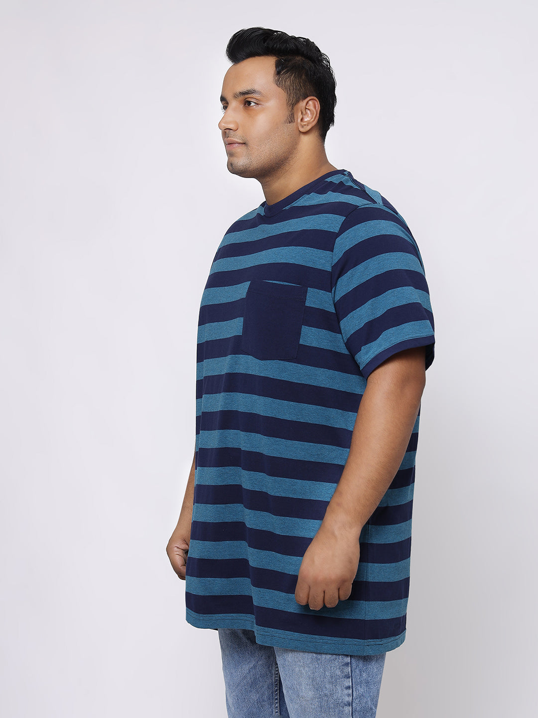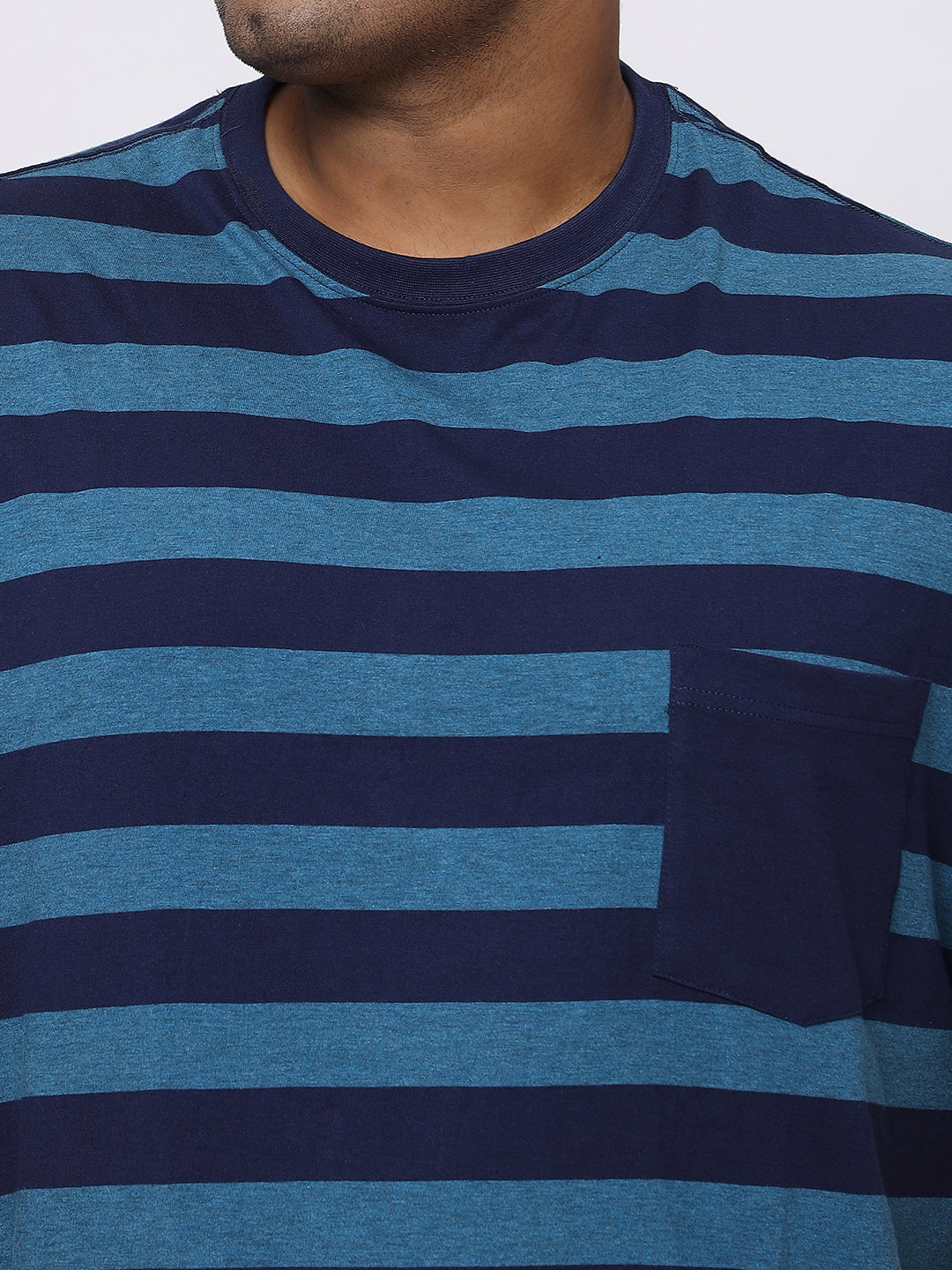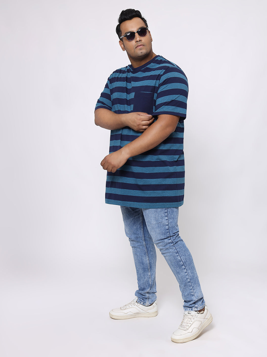 This stylish blue striped T-shirt blends comfort with casual flair. Made with breathable bio-washed cotton, it offers a soft feel and long-lasting wear. The multi-color horizontal stripes add a bold, contemporary look — perfect for casual days or weekend outings.