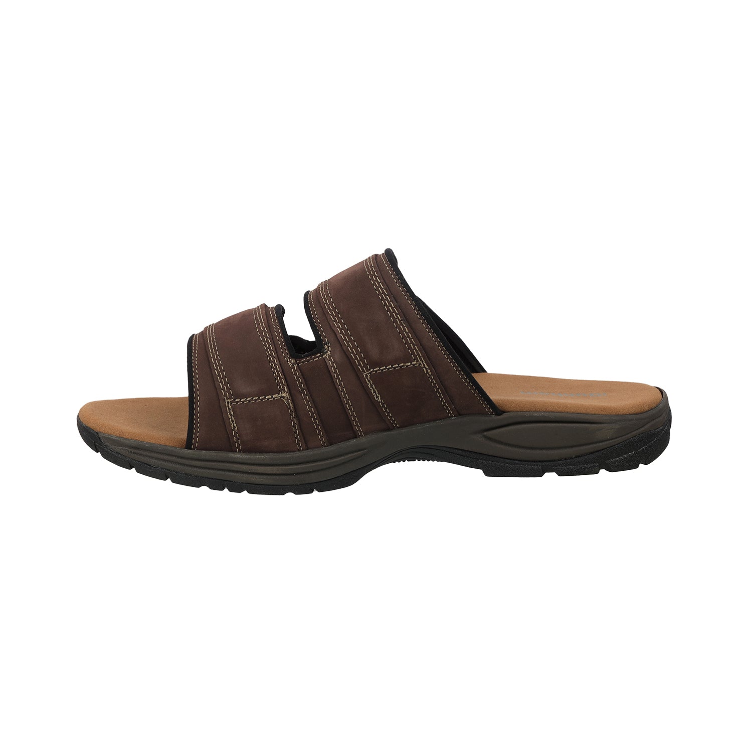 This slide sandal offers easy slip-on comfort with two adjustable straps for a personalized fit. The soft cushioned footbed provides all-day support, while the sturdy rubber outsole ensures good grip on different surfaces. Its brown finish gives a classic, versatile look suitable for casual outings and everyday wear.