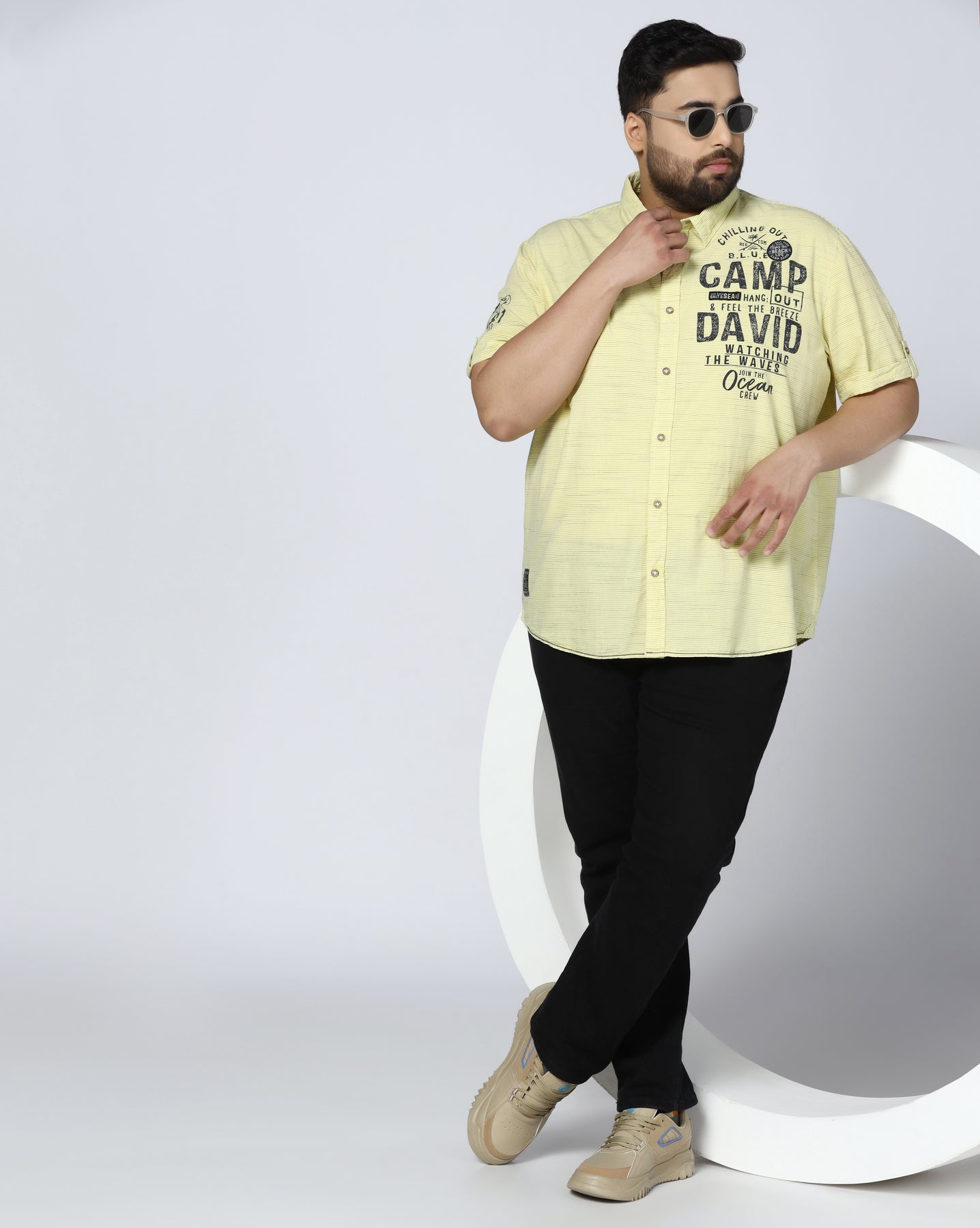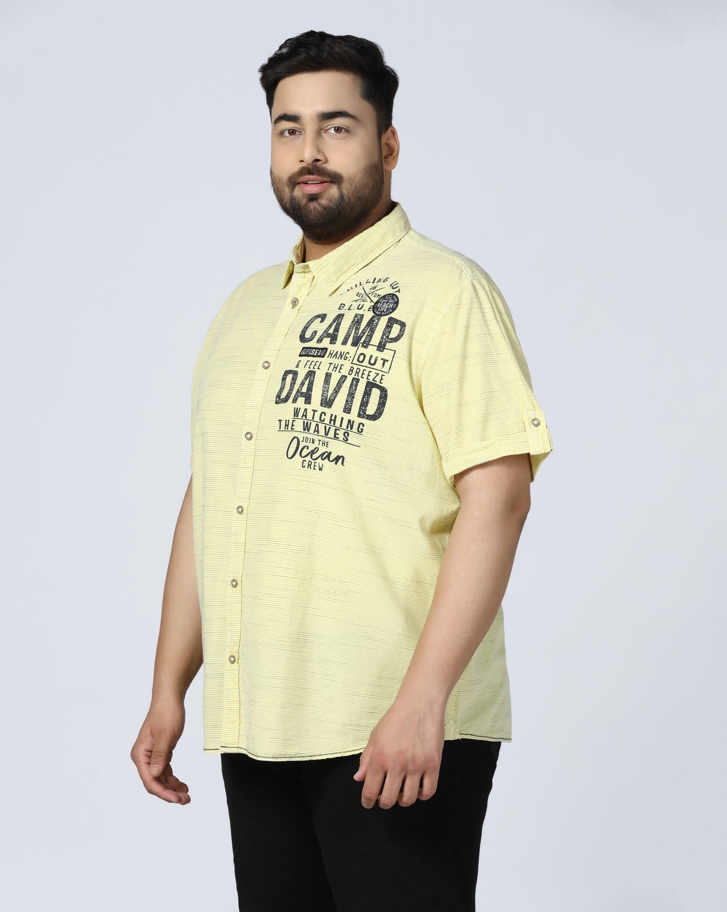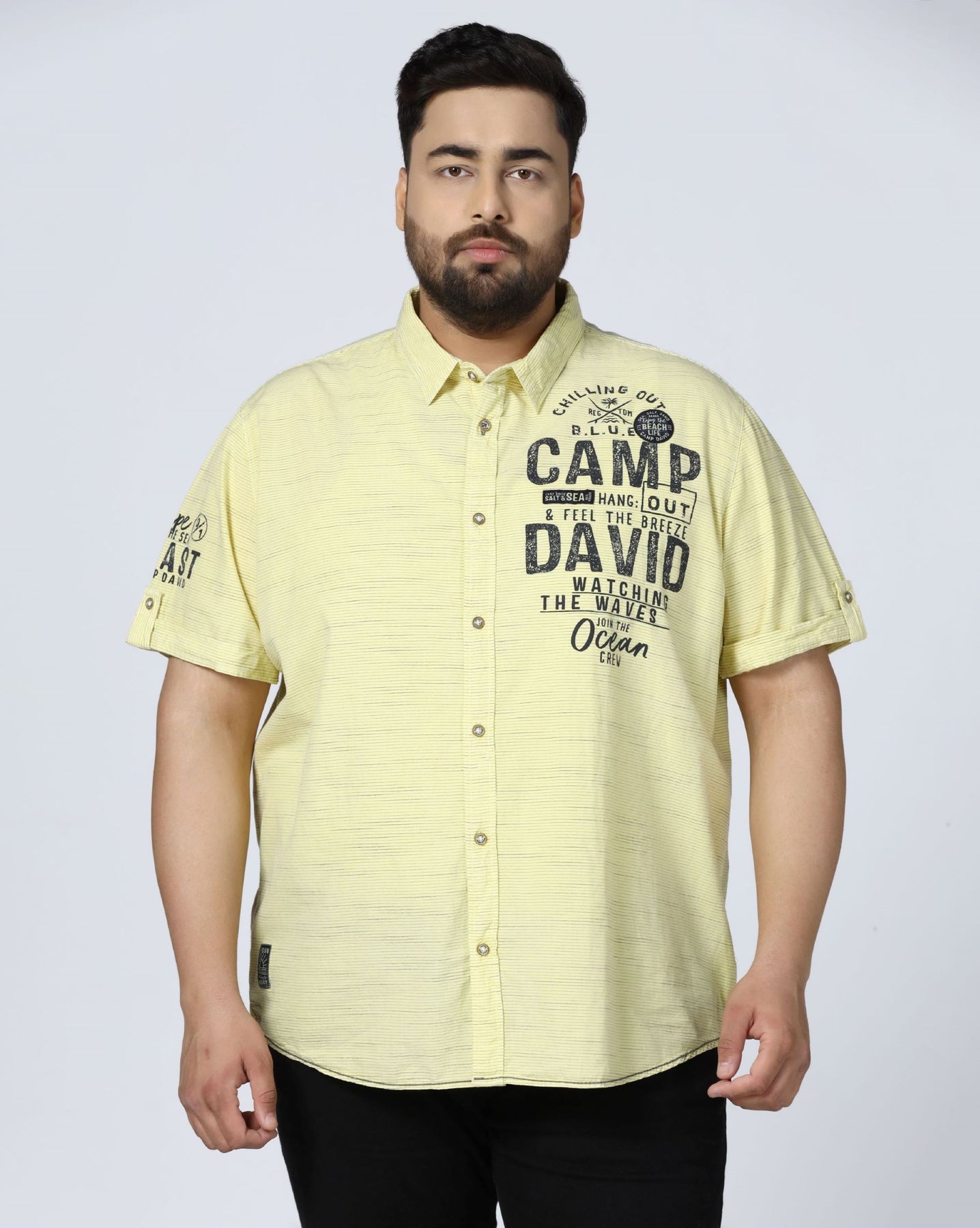 Add a fresh and vibrant touch to your wardrobe with this yellow graphic print shirt, specially designed for plus-size men. Crafted from soft and breathable cotton, it ensures maximum comfort throughout the day. The bold Camp David-inspired front print gives it a sporty and youthful appeal. Ideal for casual outings, holidays, or weekend wear, this shirt pairs perfectly with jeans or chinos for a confident and stylish look.