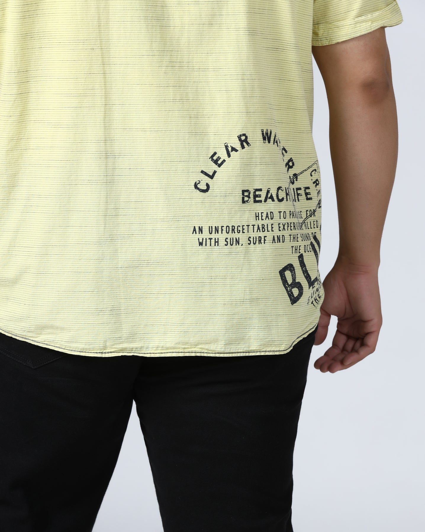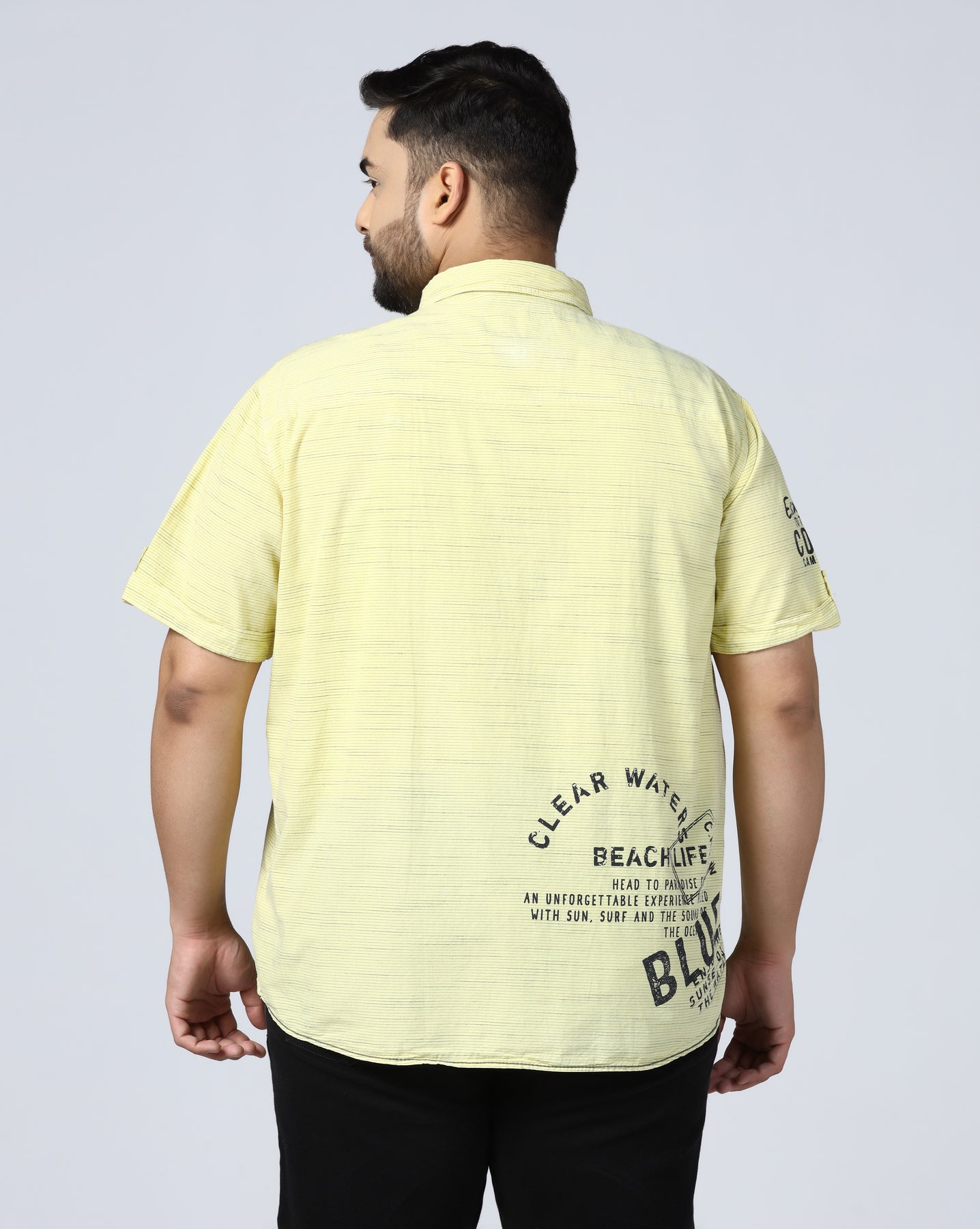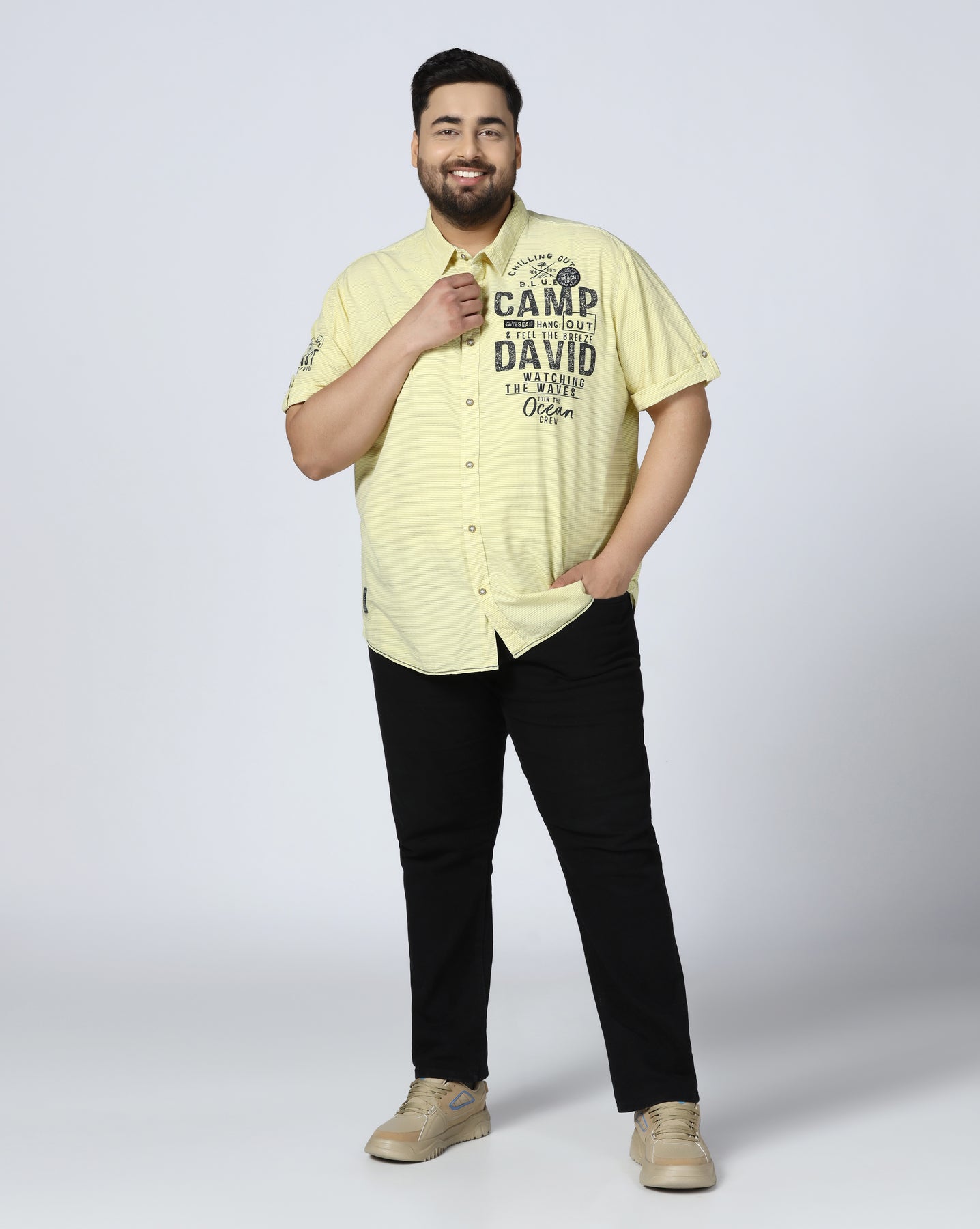 Add a fresh and vibrant touch to your wardrobe with this yellow graphic print shirt, specially designed for plus-size men. Crafted from soft and breathable cotton, it ensures maximum comfort throughout the day. The bold Camp David-inspired front print gives it a sporty and youthful appeal. Ideal for casual outings, holidays, or weekend wear, this shirt pairs perfectly with jeans or chinos for a confident and stylish look.